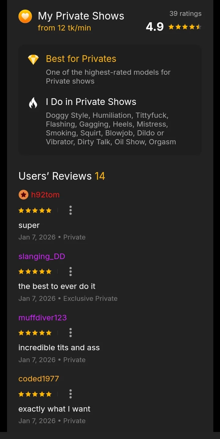 Flashing, Gagging, Heels, Mistress, Smoking, Squirt, Doggy Style, Humiliation, Tittyfuck, Blowjob, Dildo or Vibrator, Dirty Talk, Oil Show, Orgasm