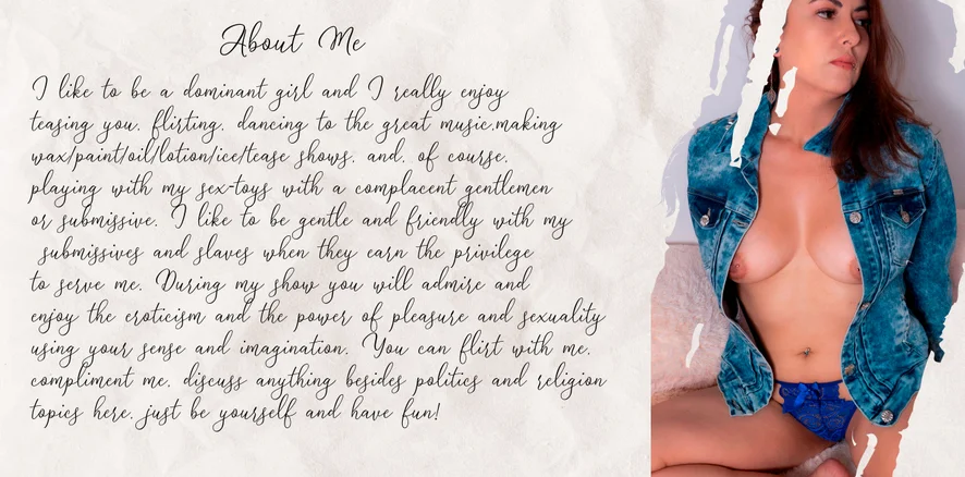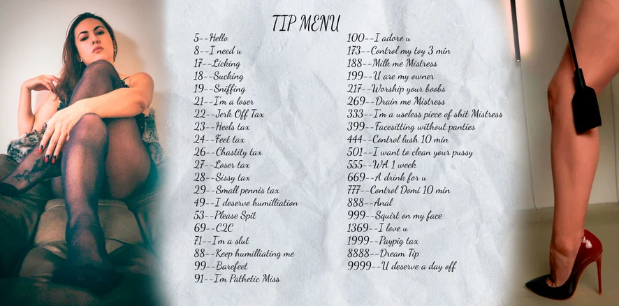 Smoking, Dirty Talk, Camel Toe, Office, Upskirt, Heels, Nylon, Mistress, Foot Fetish, Latex, Leather, Jerk-off Instruction, Cock Rating, Outdoor, Oil Show, Strapon, Sex Toys, Facesitting, Spanking, Deepthroat, Blowjob, Pegging, Twerk, Humiliation, Topless, Striptease, Nipple Toys, Masturbation, Tittyfuck, Gagging, Erotic Dance
